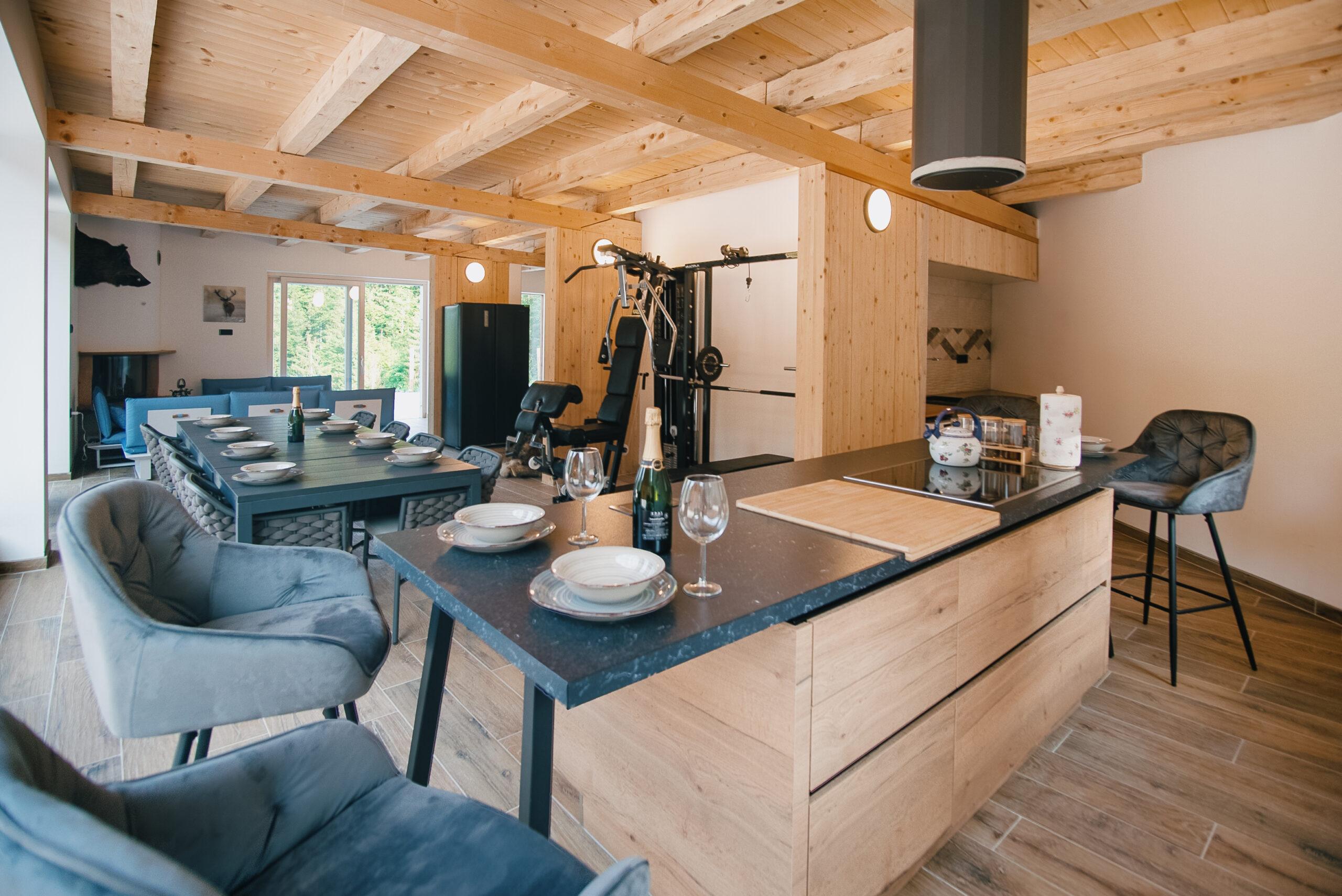 Spacious Accommodations: Chalet HerMes arT in Idrija offers six bedrooms and four bathrooms. The villa includes a living room with a fireplace, family rooms, and a fully equipped kitchen.